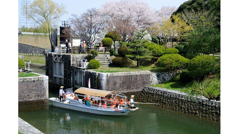 (一社)愛西市観光協会では3月下旬から11月中旬まで、国の重要文化財でもある船頭平閘を通過体験できる木曽川観光船を運航しています。木曽川と長良川の豊かな自然の中を船で巡り先人達の知恵を間近で感じることができます。乗船後には木曽三川の歴史を紹介する木曽川文庫にもぜひお立ち寄りください。