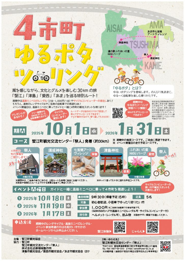 - 期間中、蟹江町観光交流センター祭人からスタートしてゆるく、蟹江町、津島市、愛西市、あま市を自転車で巡っていただくイベントです。